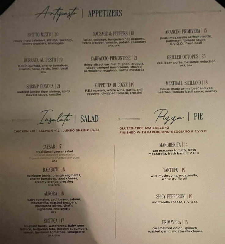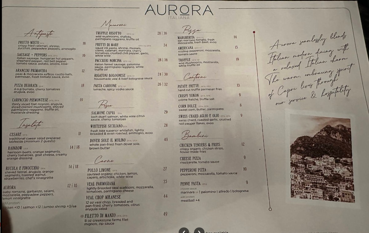 Welcome to Aurora Italiana, where traditional Italian flavors meet modern culinary artistry. Located in the heart of West Bloomfield, our menu offers a diverse selection of mouthwatering dishes crafted from the finest ingredients. Whether you're craving pasta, pizza, or something uniquely Italian, our Aurora Italiana menu has something to satisfy every taste. Come experience the true essence of Italy, right here in your neighborhood. We invite you to indulge in our passion for quality food and impeccable service.